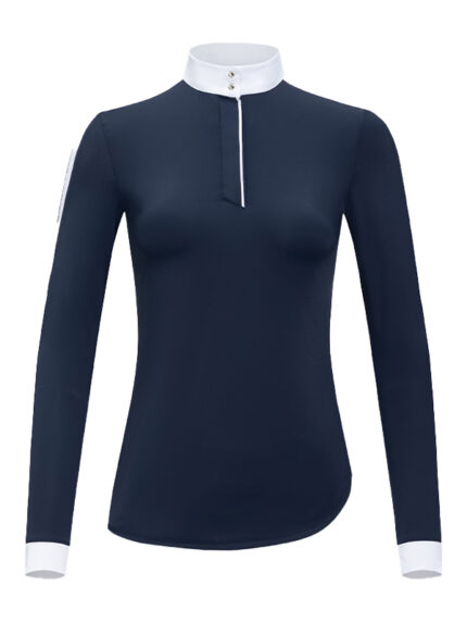 This shirt features a side vented and fabric paneling design. While enhancing breathability during movement, it also accentuates the wearer’s waistline even more. Additionally, the collar adopts a magnetic snap design, allowing for greater convenience in use. This shirt is specifically designed for ladies who want to showcase a more stylish look while horseback riding.